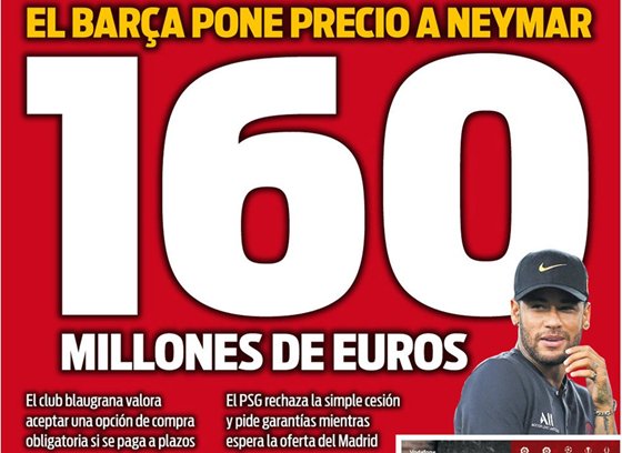 สื่อสเปนรายงานว่า ต่างดาว บาร์เซโลน่าพร้อมจ่าย 160 ล้านยูโร ในปฏิบัติการยืมตัว สตาร์ขวัญใจขาแว๊นซ์ เนย์มาร์ ขณะที่ปารีส แซงต์-แชร์กแมง จะฟังข้อเสนอแบบบังคับซื้อขาดเท่านั้น