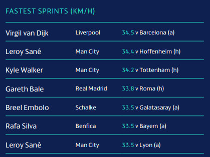 มีการเปิดเผยรายงานจากยูฟ่าว่า กองหลังของลิเวอร์พูล เฟอร์กิล ฟาน ไดจ์ค ทำสถิติวิ่งสปรินท์ได้ไวที่สุดในแชมเปี้ยนส์ลีกฤดูกาลที่ผ่านมา