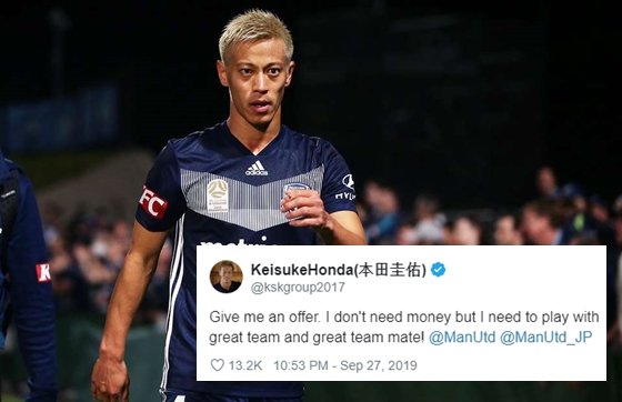 สตาร์ชาวญี่ปุ่น เคย์สุเกะ ฮอนดะ ออกมาทำแปลกเมื่อโพสต์อ่อยให้แมนเชสเตอร์ ยูไนเต็ด เซ็นสัญญาเขาไปร่วมทีม โดยบอกว่าไม่ต้องการค่าเหนื่อยเลยด้วย